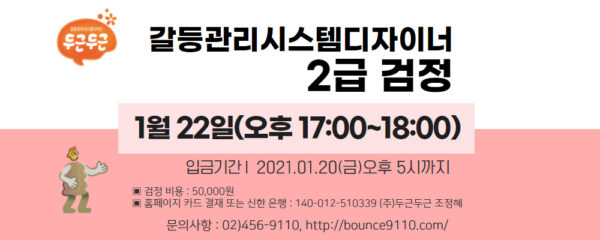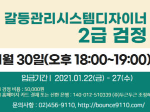 이번에 (주)두근두근에서 갈등관리시스템디자인전문가 1급 민간자격 취득 과정을 개설하였습니다.