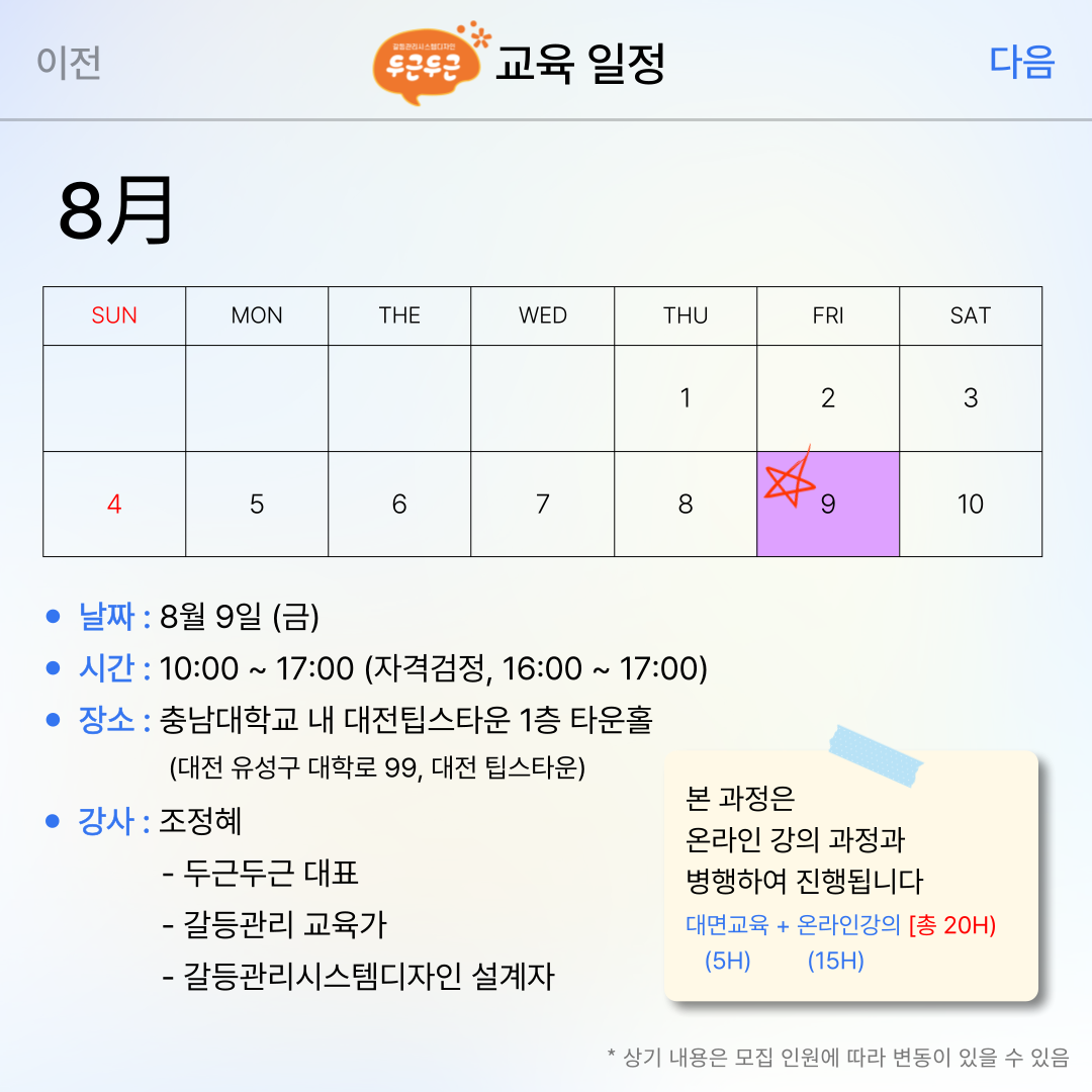 대면교육 : 8월 9일 (목) 10:00 ~ 16:00 (5H) + 온라인 강의 (15H)