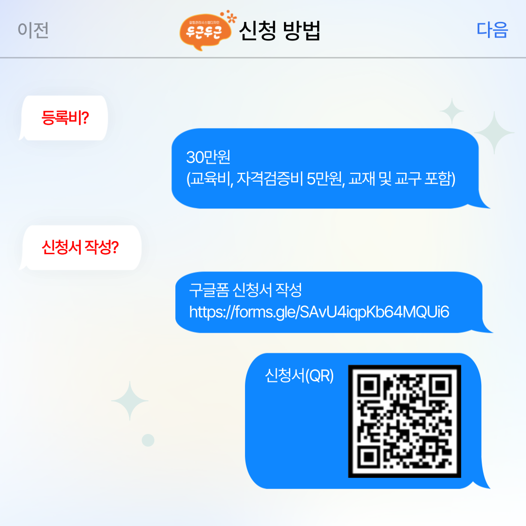 - 30만원(교육비, 자격검증비 5만원, 교재 및 교구 포함)