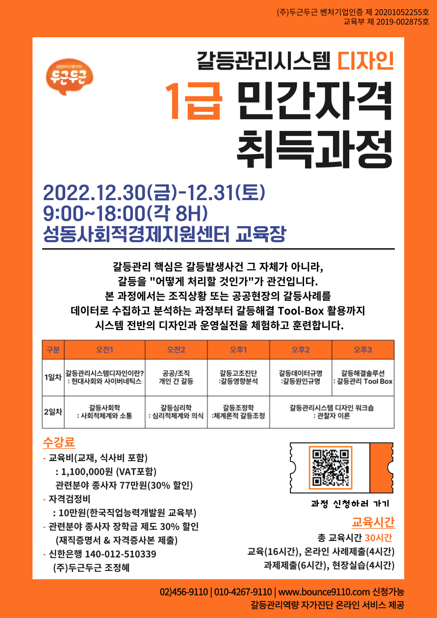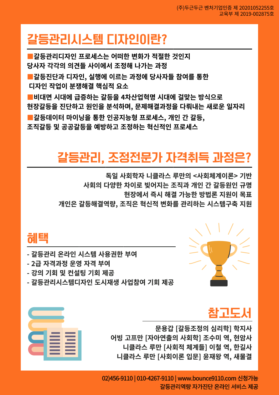 이번에 (주)두근두근에서 갈등관리시스템디자인전문가 1급 민간자격 취득 과정을 개설하였습니다.