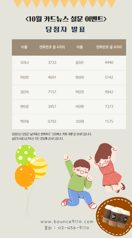 카드뉴스 당첨자 안내 Posted by (주)두근두근 Categories 공지사항 Date 2020-10-21 Comments 1 comment 카드뉴스 당첨자 10분을 안내드립니다 ! 당첨자분들은 작성해주신 번호로 연락드리겠습니다 ~ 아쉽게도 당첨이 되지 않으신 분들도 다시한번 설문참여 감사드립니다 다음에도 많은 참여 부탁드립니다 ^^!! Share: (주)두근두근 Previous post 두근두근 10월 카드뉴스 응답결과 2020-10-21 Next post 갈등관리시스템디자이너 자격검정 2급 합격자(1회) 2020-12-11 You may also like [2급] 갈등관리시스템디자인전문가 민간자격 합격자(10월) 23 10월, 2024 . “갈등관리, 우리 모두가 터득해야할 삶의 기술이자 지혜입니다.” 갈등관리시스템디자인전문가 2급합격을 축하드립니다 2024년 갈등관리시스템디자인 민간자격취득 자격검정 시행 일정 26 9월, 2024 2024년 갈등관리시스템디자인전문가 민간자격취득 교육 및 자격검정 일정 안내 8 1월, 2024 2024년 갈등관리시스템디자인전문가 민간자격취득(교육부 제2019-002875호) 교육 과정 및 자격검정 일정 안내입니다. 2급 과정: 주중(8시간 대면과정), 주말(4시간+4시간 비대면 과정) 1급 과정: 8시간+8시간 대면 과정 슈퍼바이져 과정: 3개월 간의 대면 과정으로 진행되며 강의 및 갈등관리 전문가로서 실무 현장 전문성을 키우는 과정으로 진행될 예정. …